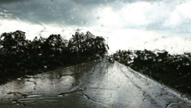 2) Assess the conditions. As the rain starts, grease, oil and even asphalt binder built up over the past weeks and months start rising to the road surface. Oil floats on water, creating a slippery film that coats the road long before any visible puddles form.