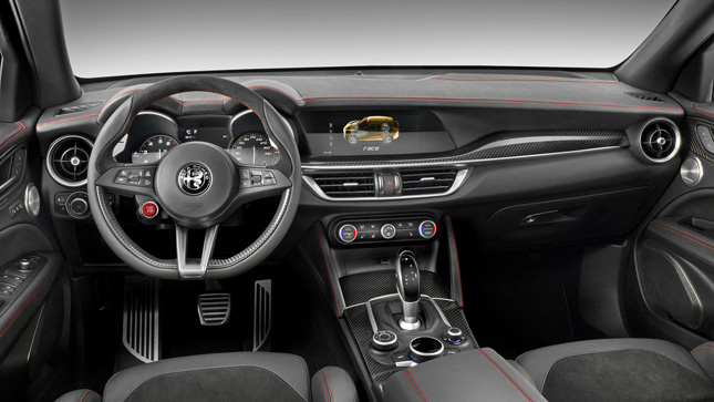 Power can be distributed across both sides of the rear axle thanks to torque vectoring, sharpening things further, while electronically controlled dampers keep the suspension under control. Alfa also boasts of perfect weight distribution, which we’re to assume is 50:50. Carbon componentry means it should weigh less than SUV rivals, though in most cases that ought not to be a difficult task.