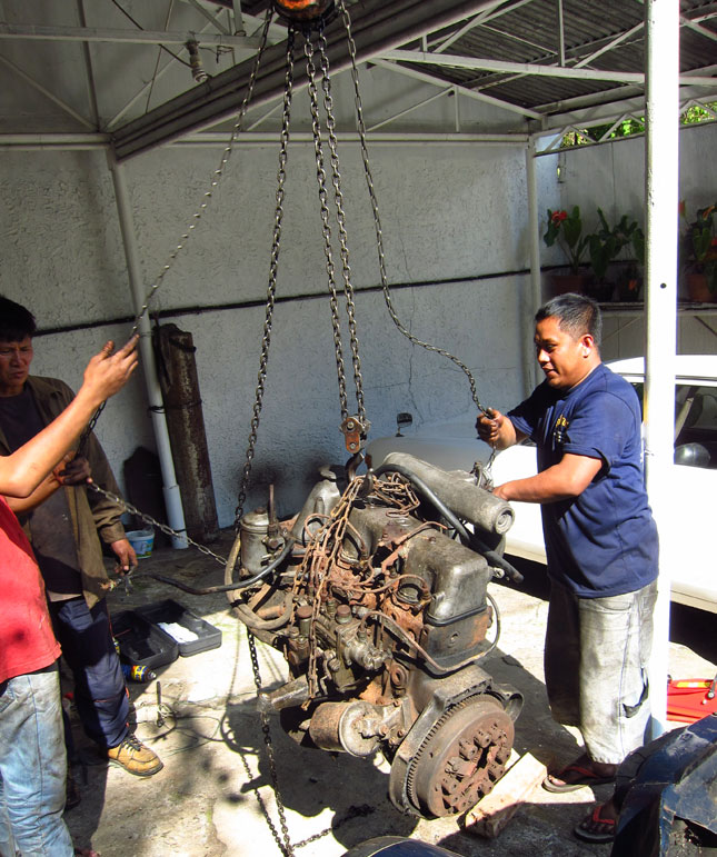 The scary part was when we lifted the engine out. The chain block was hanging from a flimsy rafter on the garage’s ceiling. I’m glad that it held and the whole garage didn’t come crashing down.