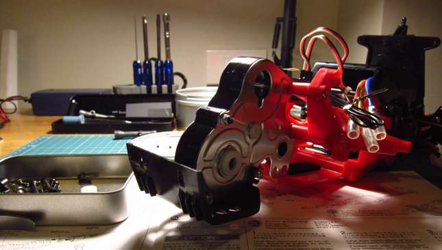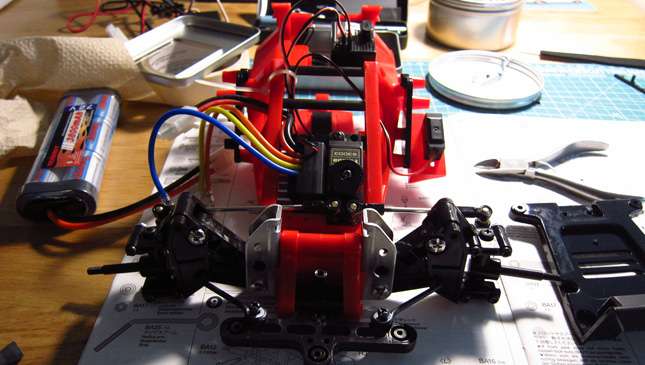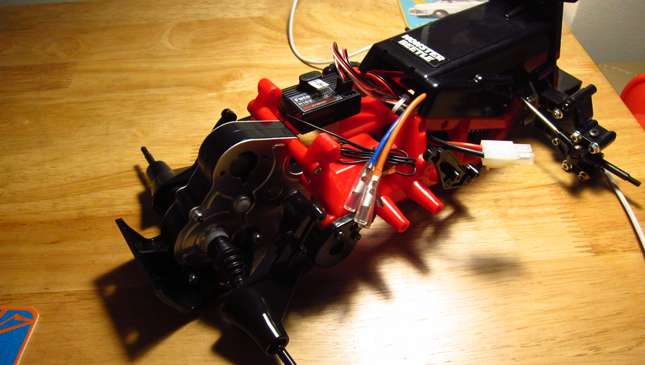 This is the NiMH battery I scored from Amazon, while the steering servo came with the entry-level Futaba radio that I bought. The box with the colorful wires sticking out of it is the speed controller that is supplied with the kit. Back in the day these were mechanical and required a separate servo to operate.