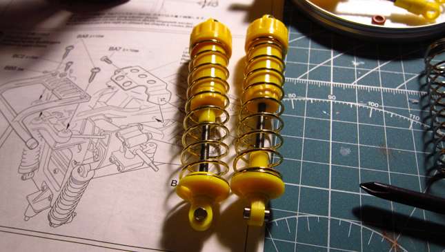 These are oil-filled units that need to be assembled carefully. You get realistic damping characteristics with these, which is another reason why I enjoy watching RC buggies in action.