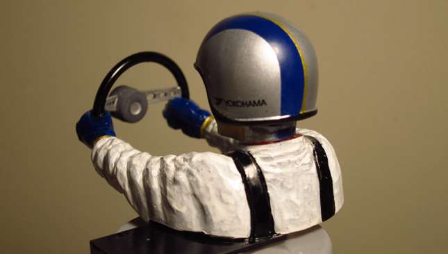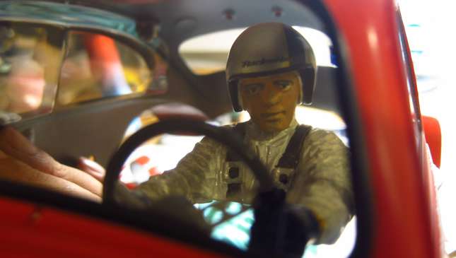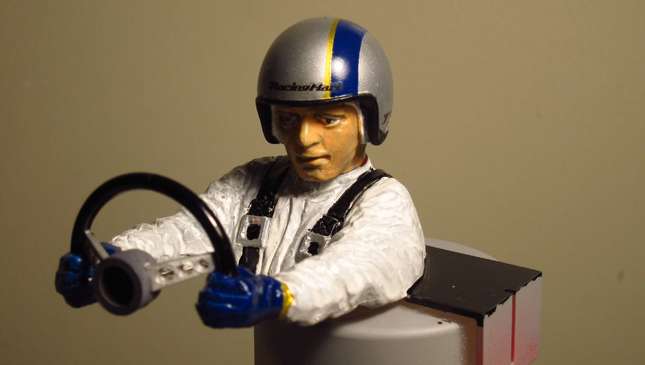 Painting the driver is the first thing I did before I even started building the chassis. It will become a habit for future builds, because it's nice to get this important detail out of the way first. Tamiya actually gave these dudes names. This here is Albert Attaboy. I tried my best to emulate the Rothmans Racing blue-and-gold livery. Do you like the blue and gold stripe?