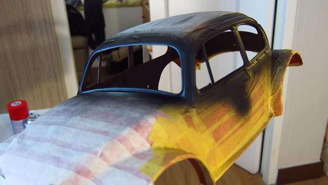 After laying down multiple the coats of Bright Red, It was time to mask the body to paint the window trim. Some scale modelers don't bother with this detail, but I think that the effort is worth it. I'm happy with the result!