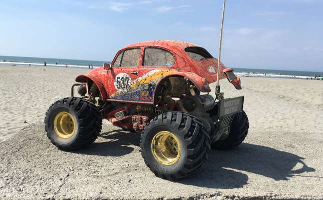 That's the evolution of my Monster Beetle through one year of ownership. As you can see, I've taken it everywhere. I wrapped the vital electronics in balloons to make them waterproof because I already fried a speed controller because of dust and water. I've changed the wheels and tires to suit my mood; did a semi-custom decal job on it to make it look like my own; and swapped to a faster motor after the original began to slow down. The final photo is how my first RC build sits on the shelf right now. I can't wait to take it to the beach again.