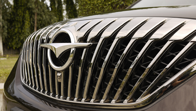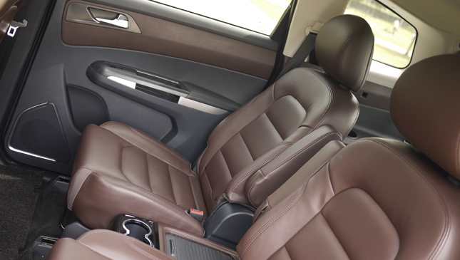 That large exterior opens up to reveal a large interior draped in chocolate-colored faux leather and plastics rendered in a palette of black, matte silver and reddish brown bathed in muted sunlight streaming through the large sunroof. Panel fit and gaps are laser tight. Granted, the plastics are still hard in certain areas, but cover up the logo and you’d be hard pressed to tell that this isn’t a mainstream Japanese or Korean car.