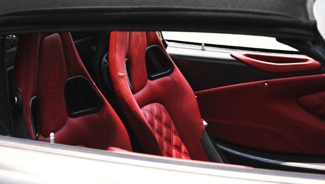 Once inside, you'll appreciate the cabin’s minimalist approach. The only comfort amenities you have are air-conditioning and an Alpine deck, which I didn't bother turning on because the tune you want to hear is behind you. The red quilted leather buckets are quite comfortable, and a good combination with the Carbon Gray exterior. As for storage space, what storage space? Even our lensman had to change his hard case to a smaller and softer camera bag to fit that little boot behind the engine.