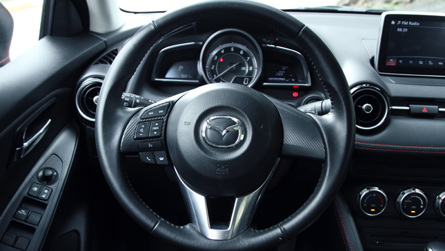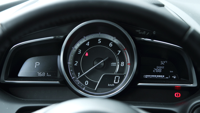 The Skyactiv 1.5-liter engine fires up with a naughty blare--the only time when it’s really audible. It soon settles down into near-silence, where it’s content to stay. The claim to fame of the Skyactiv gasoline engines is their high compression ratio, meant to produce more torque and better responsiveness even at low revs. It works in the 2, where gentle throttle inputs are enough to keep up with city traffic. Less stomping on the throttle to get going means less fuel consumed. The fuel-consumption reading during our test period was around 9-10km/L, even after driving through bladder-bursting traffic. The motor takes regular 91-octane unleaded.