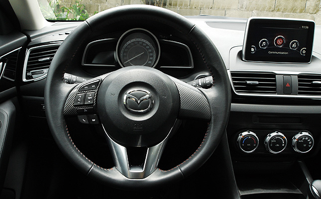 Carbon fiber-like and piano-black accents on both the dashboard and the door panels enhance the premium feel of the 3's interior, as does the leather-wrapped steering wheel. And although the seats are only clad in fabric, at least your bottom won't get cooked when you sit on it after parking the car under the sun. Helping add to the sporty character of the car are the center-mounted analog speedometer flanked by the digital tachometer and the fuel gauge, and the floor-mounted, organ pedal-style throttle pedal.