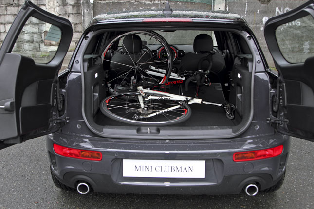 Bigger items are also a breeze to accommodate, and as you can see, I was able to fit my road bike after dropping the rear seatbacks. It’s just like loading stuff into a giant refrigerator. Another reason the great-looking barn-door design is clever is that in a car as low as the Clubman, you would probably bump your head or strain your back when crouching down too low under a conventional hatch.