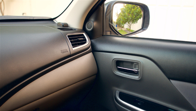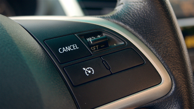 The leather-wrapped steering wheel is surprisingly small and easy to grip; its size and heft are reminiscent of Mitsubishi’s sedan offerings.