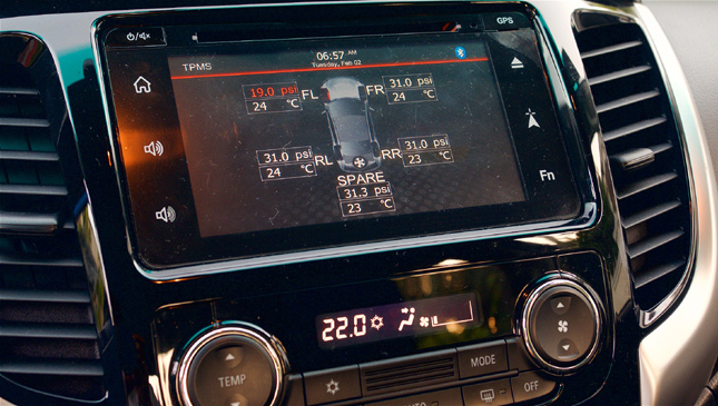 The Strada has an interesting assortment of gadgets. There is a smart key system for hassle-free entry, as well as a push-to-start button. Buttons for the cruise control and the audio settings are within easy reach on the sides of the steering wheel, and the center view is dominated by a 6.75-inch touchscreen that hosts the radio, the backing-up camera, the tire pressure monitoring system (a Mitsubishi staple!), and the DVD player.
