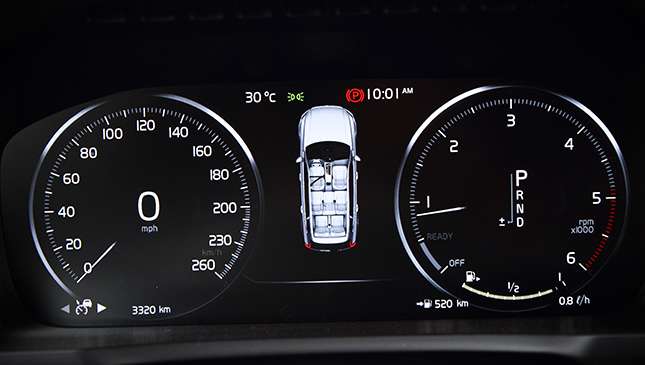 One novel feature that the Volvo has is ‘smart’ cruise control, integrated with a Pilot Assist system. This means the XC90 can automatically maintain its distance to the car in front, whether in a traffic jam or on the highway. A small icon below the tachometer indicates when it’s locked on. What’s more remarkable is that Pilot Assist also takes over the steering. A radar sensor determines distance to the preceding car, while cameras scan for road markings to keep the car in a given lane. When it locks on to the car ahead, a small white icon lights up, and when it detects the proper lane, a green steering wheel symbol is shown.