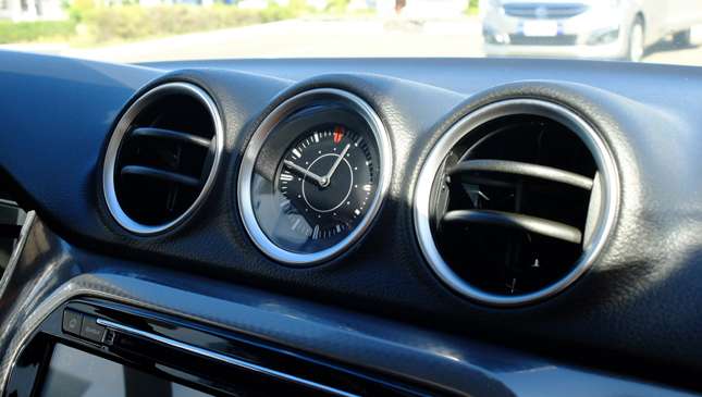 Things get a little less endearing once you notice where the car sort of cheaps out. The interior materials are just plain uninspiring. The faux carbon fiber trim on the dash is lackluster, plus you're enveloped by hard, shiny black plastics. Also, we're not digging the analog clock up center—these things are supposed to convey a sense of premium-ness, and the one on here does anything but.