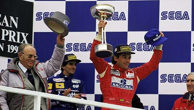 Having dropped to sixth at the start, he still ended lap one in first place, having overhauled Prost, Hill, and Schumacher. Sega sponsored the race, and Senna won a Sonic the Hedgehog-topped trophy for his trouble.