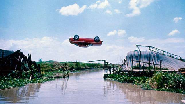 Still considered one of the most difficult, iconic stunts in movie history, two noises totally ruined the incredible barrel-roll sequence in The Man with the Golden Gun. First, Roger Moore’s shocking “Ah sure am, boy” Southerner accent that’s worse than Brosnan’s British impression. The second? A slide-whistle sound effect dubbed over the eye-popping moment his nicked AMC Hornet takes to the Thai sky.