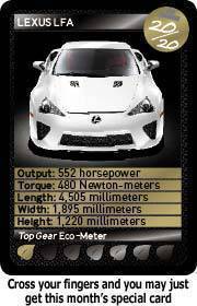 Every month, all copies shall come with the same 10-card pack, so there's no need to buy multiple copies of the same issue just to complete the set (unless you want to, of course). But to make your card-collecting a bit more fun, we're also giving away a special card per series. This special card usually features a supercar with nearly unbeatable specs. Only 500 pieces of this special card will be printed per series. There will thus be five different special cards in total.