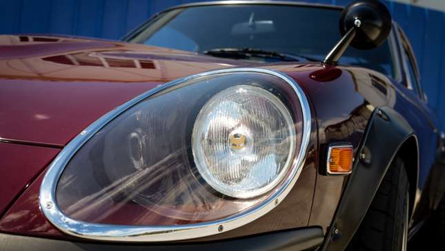 Thus, for this Z, only the best would do. The awkward Federal 'five mph' bumpers were first to go, and in their place, a full 240ZG 'G-Nose' kit from Marugen Shoukai, composed of the aerodynamic nose cone, perspex headlight covers, bolt-on fenders, and rear spoiler of the rare Japanese Group 4 homologation special. Datsun 510 long-stalk fender mirrors complete the look, though they're mounted symmetrically, as opposed to the staggered setup of the original ZG. The SEV Marchal cat-head headlights are a late addition, at the suggestion of a friend.