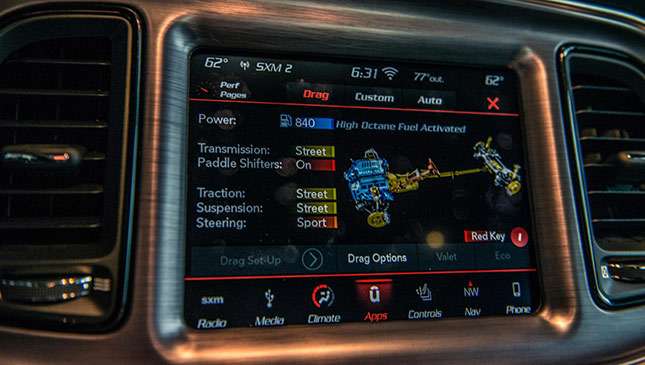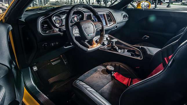 Absolutely. Inside it doesn’t feel too different to a Hellcat—the seats are big and plush for instance, but press the SRT button and the screen brings up a host of new selectable settings. This is where you can change the engine mode to run on 100 octane fuel, engage line lock, set the rpm for launch control, alter the suspension settings, and use the trans brake.