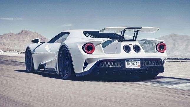 The racing version of the Ford GT has no rear bumper at all, to make way for a full-width diffuser that looks like the world’s largest mandolin. It’s one of the most aggressive rear ends on the LM GTE grid. The road car tones that down a bit for the sake of practicality and styling, but still uses vanes to suck that air smoothly out of the back of the car, creating an area of low pressure along the flat underbody and more downforce.