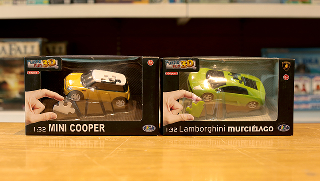 3D car puzzle. These 3D puzzles come in 1:32 scale and a variety of models, including Lamborghinis and Minis. One set is 64 pieces. Price: P900.