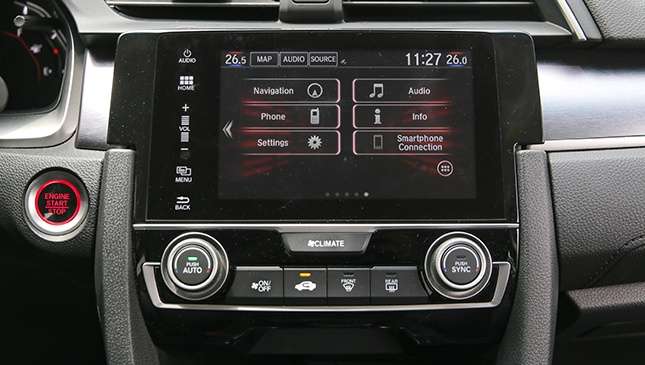 The Civic's stylish silhouette comes at a price. The rear window is small, making it somewhat problematic to back up into a tight parking space while you’re still gaining a feel for the car's dimensions. Thankfully, yes, there is a backup camera. Other niceties include a push-to-start button, dual zone climate control, Econ Mode, and the best looking fully-electronic gauges in the market.