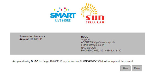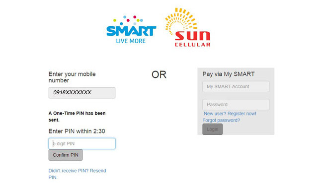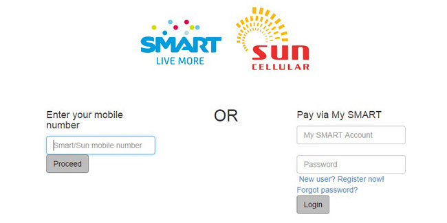 6. Once you've confirmed your mode of payment, you'll be asked to enter either your mobile phone number or your Smart or Sun account username and password.