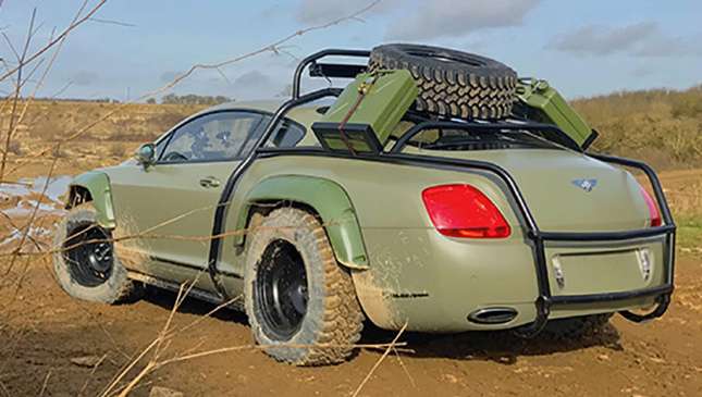 Complete with extra fuel tanks, underbody armor, upgraded front brakes and a khaki wrap, this Conti's been treated to an estimated £25,000 of modifications. It’s leggy underneath: The donor car covered 120,000 miles (193,000km) in its previous life, so even with a full service history and street-legal MoT, it's not going to be a cheap machine to keep on the road.