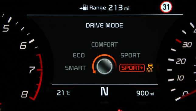 The Stinger suffers from a phenomenon we shall call Mode Overload. Or maybe OverMode. Kia’s very proud of the many settings you can choose from, but there’s not a massive amount of difference between the five mood swings.