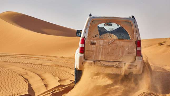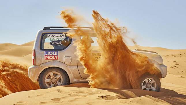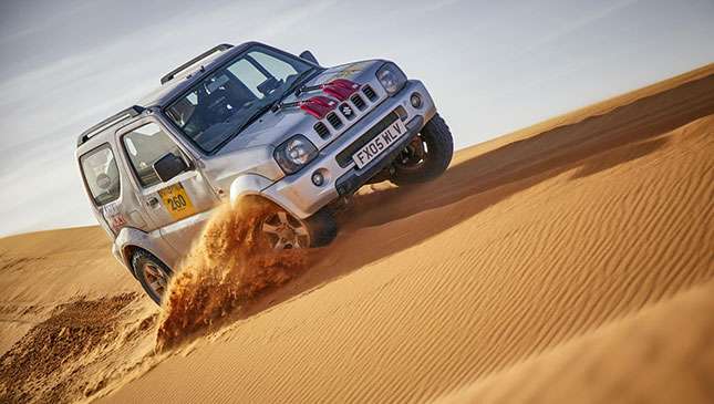 This isn’t much fun. I’m wearing triple-layer Nomex, I can feel sweat forming a meniscus between bald head and helmet lining, and I’m on my knees in a desert, desperately trying to shovel sand out from around the back wheel of a Suzuki Jimny.