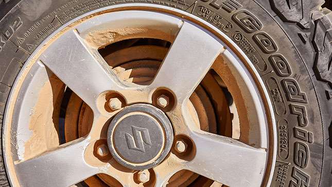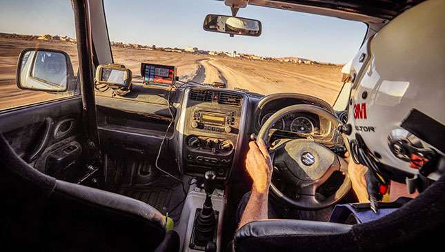 The Jimny is 12 years old, has 133,000km on the clock and will be off to the great scrapheap in the sky soon. John reckons they last three events before scrappage beckons. It is worryingly vague in almost every measurement. The gear lever is gloopy, there’s no power, it’s tall, short, narrow and deeply unstable. But at least the turning circle is tight—handy when you’re in something as restrictive as a desert.