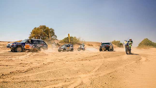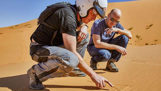 "You need to get a taste for camel poo." Must be some sort of desert survival tip. Sketches in the sand have revealed the importance of working out wind direction, we’ve shaded our eyes and tried to discern color changes, and seen just how difficult it is to establish depth perception, angle or terrain when you’re driving toward the sun, compared with driving away. Driving in sand is hard. Racing in sand is downright treacherous. And camel poo is your friend. "Camels aren’t stupid," John continues, "they don’t want to walk in soft sand, so follow their poo."