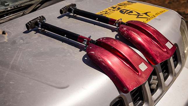 Theory done, it’s time for the practical. 'My' Suzuki Jimny has a pair of shovels on the hood, and in the back some carpet and a scuba tank. I kid you not. John claims carpet, laid face down on the sand, is a better solution to help free a stuck car than a sand ladder. And that an on-board compressor is a vastly expensive way of reinflating tires, when a 300 bar scuba tank will do the job in a jiffy.