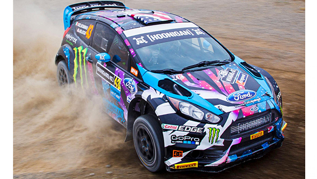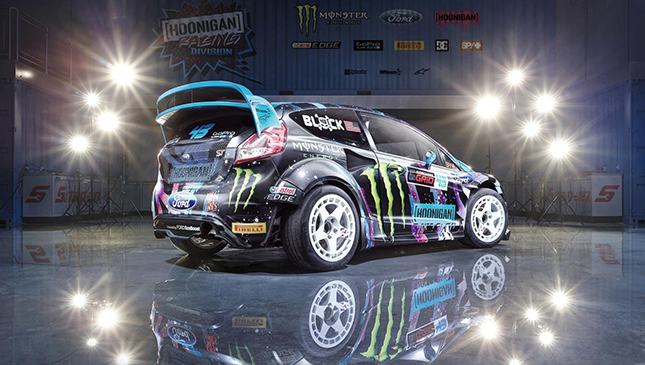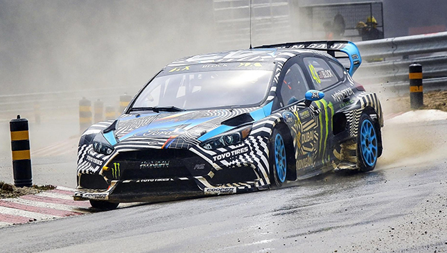 Ken’s latest toy, seen hanging its tires out over a dock in Gymkhana 9, is also his 2016 World Rallycross Championship car. Its engine is smaller than the road-going RS (2.0-liter versus 2.3), but with 600hp, far mightier. Drift mode is compulsory.
