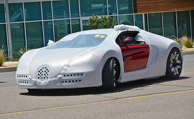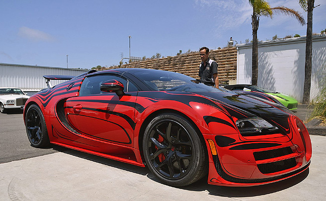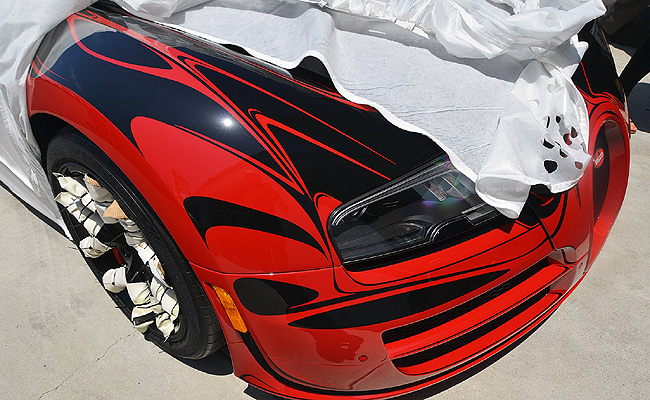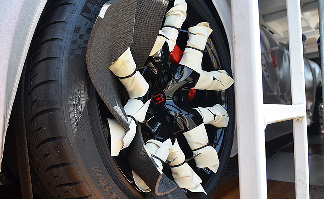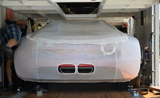 This Veyron right here is called the L'Or Rouge, a one-off special version of the Veyron Grand Sport Vitesse. Unlike in the case of mass-market cars, which only have protective covering on the hood and the roof, this particular Veyron is completely covered all over--save for the exhaust, of course--as it is being delivered to the dealership. A skilled technician then has the delicate task of freeing the car from its protective wrap.