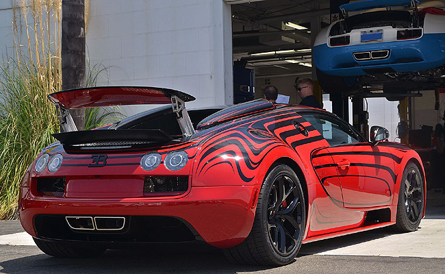 As the car is being driven into the dealership, we can't help but notice that there are already two "standard" Veyrons in it: The first one is parked outside with the L'Or Rouge parking right beside it, and another one inside the service area and hoisted up on the hydraulic lifters.