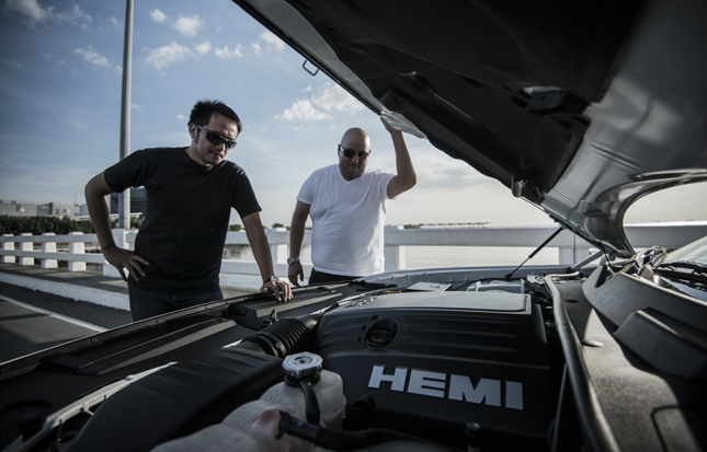 A tour with Vin Dinzo and Pau Walker isn’t complete without a car. For cruising today, we have a spanking new Dodge Challenger R/T with a 5.7-liter Hemi V8. It’s a wicked ride, a blend of retro looks and modern lines. It’s also huge and imposing, perfect for intimidating pimply kids and their rice rockets. But if the young ones want some action with the Dinzo, this Challenger has 372 horses under its hood to put the kids in their place.