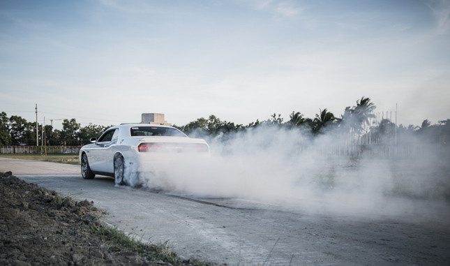 The city starts to cool down, but our day is only beginning to heat up. We discover a deserted street in the middle of an empty lot, and we see what the Hemi can do. We stop, take a quick look around for obstacles, and proceed to do a burnout. The V8 overpowers the massive 20-inchers in the rear and produces a cloud of Goodyear smoke. It feels good. This is what a real car does.