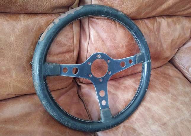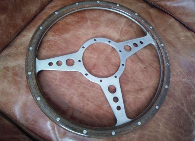 Another wheel manufacturer that I'm particularly fond of is the British manufacturer Moto-Lita. I liked the Mark III and Mark IV with the lightening holes in the spokes. I got this wheel from the used market, and it probably came from an old Austin Mini. It was in horrible shape when I got it: There were varnish drippings on the wood finish and varnish overspray on the aluminum spokes. It was in such a sorry state that I had to strip and refinish it. The restoration job isn’t finished.