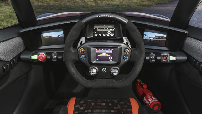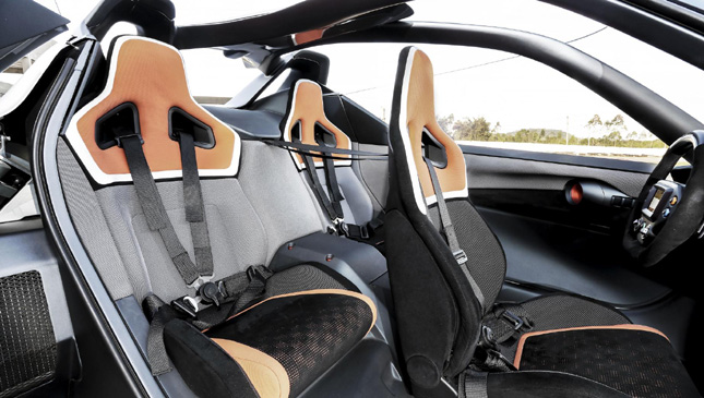 Door safely operated, the rest of the BladeGlider welcome procedure is a doddle. There’s no sill to step across, just a narrow apron of floor to the front and center of the driver’s Recaro bucket, flanked by identical passenger seats behind each of the driver’s shoulders, settled atop the battery housing.