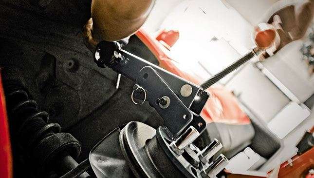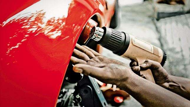 2) Attach the wheel-arch reforming tool to the hub. It fits on like a tire does. Tighten and secure the lug nuts using the same torque as you would when attaching a wheel. Now, adjust the tool so that it hits the fender lip at a mild angle first. Do not attempt an extreme roll right away. But before getting to work, you have to heat the fender first to keep the paint from cracking. Do not keep the gun pointed in one place for an extended period as this can cause the paint to bubble.