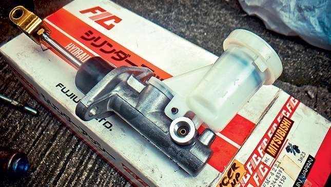 Flush the clutch line by pumping clean brake fluid into it. Use a clean oil can and a flexible hose. Now, install the master and slave cylinder but do not over tighten the fittings. Fill the reservoir with new brake fluid.