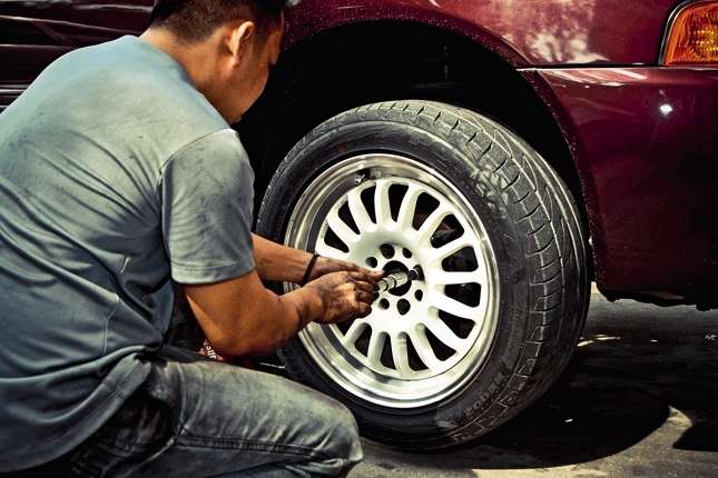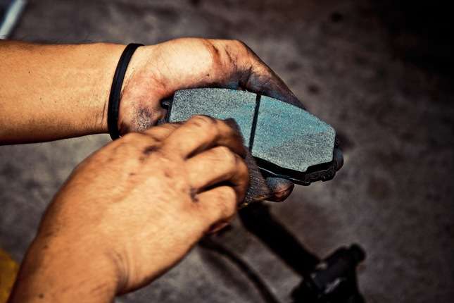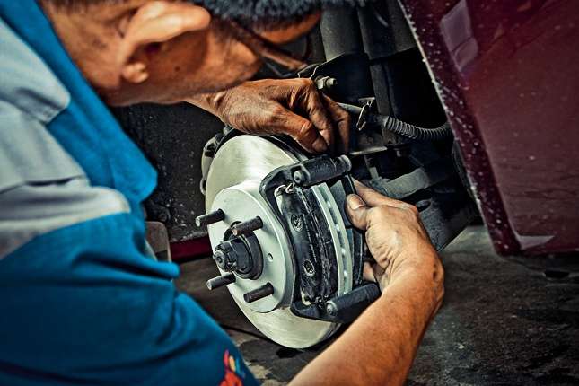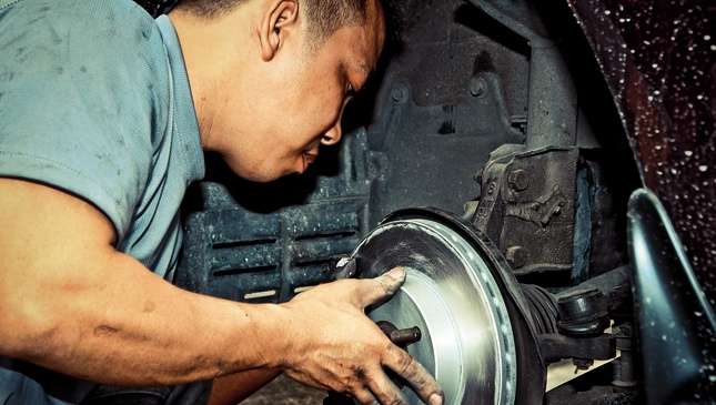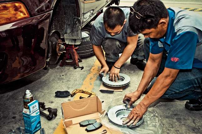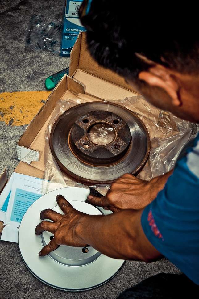 3) Before fitting the new rotor, the mechanics at Supreme Motor suggest using sand paper to remove the protective coating. They also sand down the new brake pads to make sure that they bite properly. After placing the rotor on the hub, use a clamp to press in the caliper pistons, position the new brake pads, and then bolt the assembly back in. Now, bleed the brakes. Wait a while for braking force to return. You may need to drive a few kilometers before braking force returns to normal.
