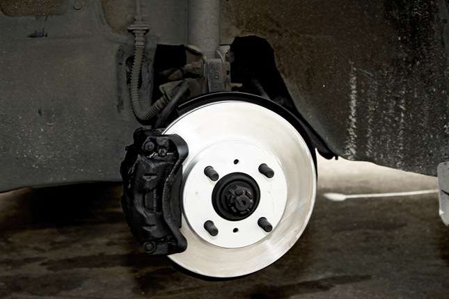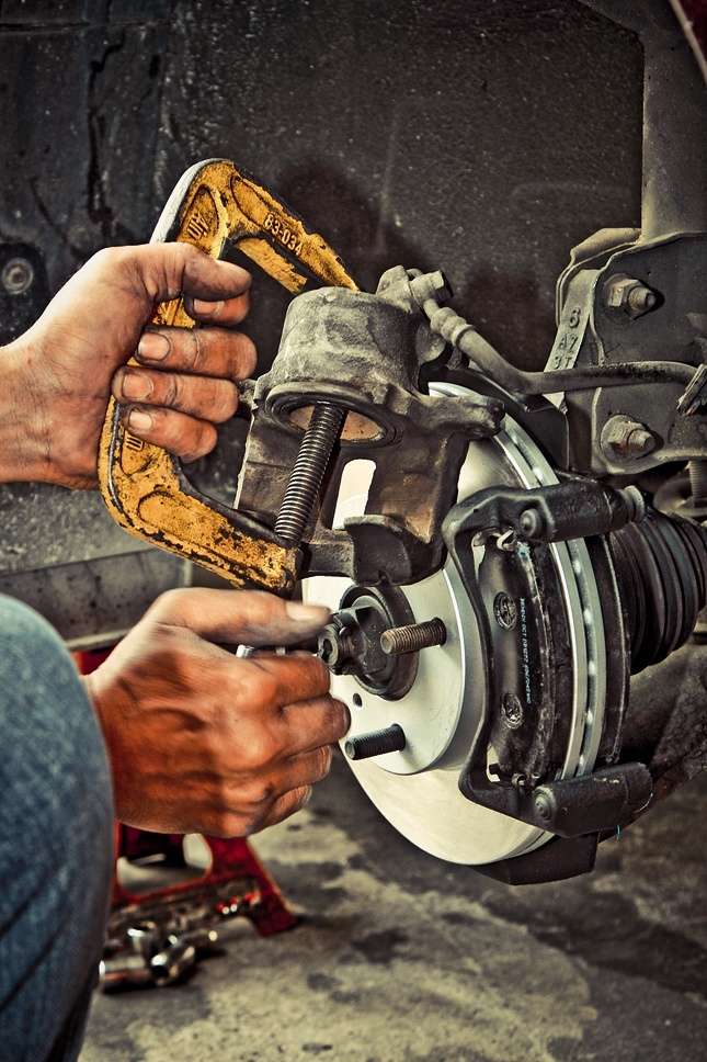 1) Loosen the lug nuts and raise the vehicle with a lift or jack. Remove the wheel and place it under the car for added safety. Find the bolts that hold the caliper in place and loosen them. Remove the old brake pads, and then lift the caliper from the rotor. Do not let the heavy caliper dangle from the brake line. Find a way to support it.