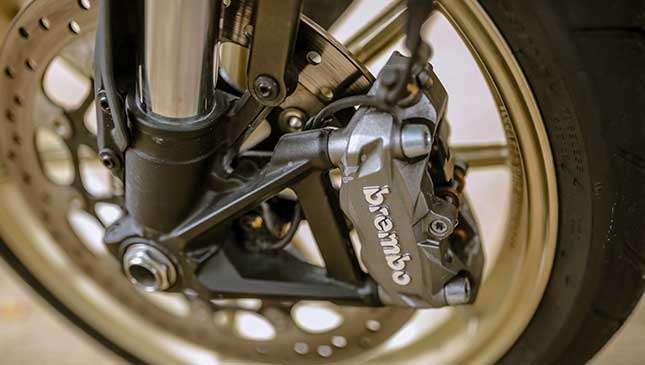 I like the front and rear Brembo brakes with ABS that guarantee stopping power. Although it's equipped with only a single disc monobloc caliper in front in line with its minimalist styling, the Café Racer halts promptly when the rider commands it. Brake modulation of this Scrambler is among the best. There's neither a sticky nor spongy feel when braking, and the brake lever is light to press.