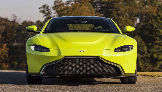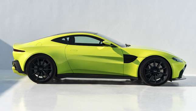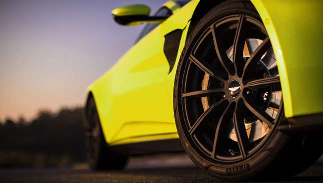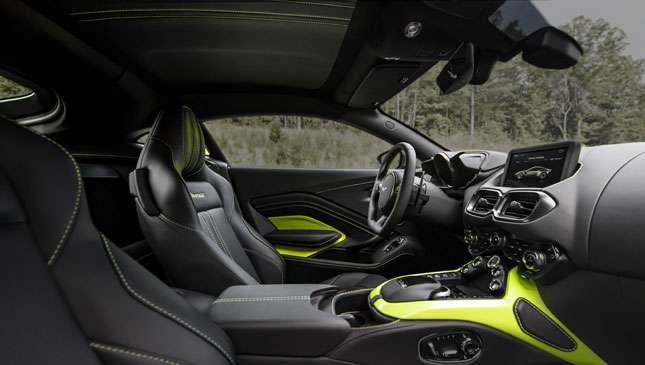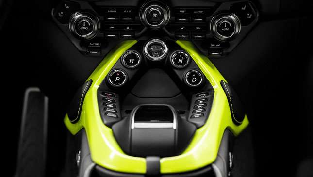 Inside, Aston says that it's foregone the usual fluid curves in favor of "sharp, focused lines denoting the more aggressive nature of the car." The driver-centric layout includes rotary and toggle-style controls for the different features. Optional color accents on the seats and panels reflect the car's exterior. The triangular cluster of buttons to control the transmission resemble something out of an alien spaceship, especially in the Lime Essence color pictured here. Naturally, there's myriad of optional leather, carbon fiber, and what have you, to choose from.