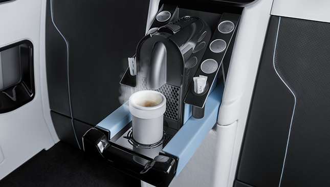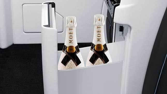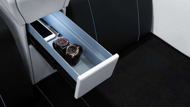 VIP Business Seats with power-extendable footrests that can be adjusted to a full sleeping position allows passengers to enjoy the state-of-the-art entertainment system in as comfortable a manner as possible. They're heated and feature a massage function as well as adjustable lumbar support. The interior is lined with fine leather and Alcantara and wood or carbon fiber elements.