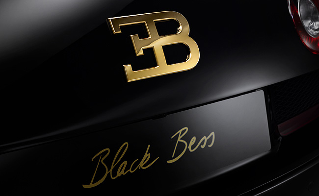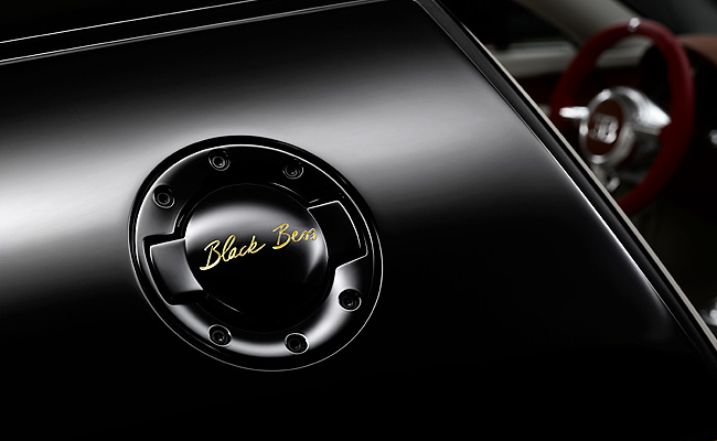 The Black Bess Vitesse's body is made entirely of carbon fiber and, just like its predecessor, is painted completely black. And like the original Black Bess, its modern counterpart has gold-colored accents, like body components that are coated in 24-carat gold, including the Bugatti horseshoe on the black front grille. Sporting a similarly brilliant gold finish are the EB logo on the rear of the vehicle and the hub covers on the black rims. The tank and the oil caps, meanwhile, have been engraved with the "Black Bess" nameplate and elegantly finished with gold paint.