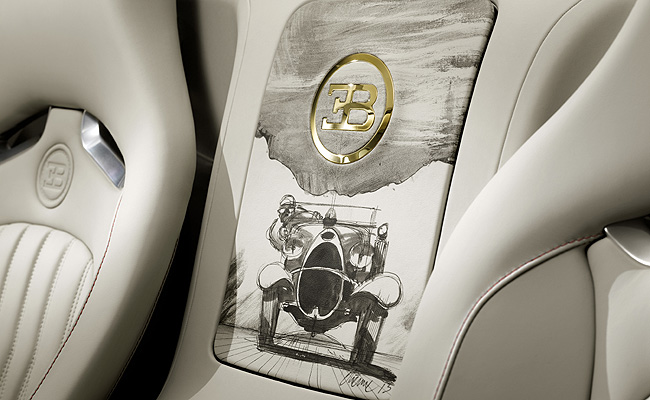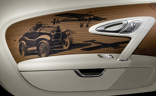 The interior is fully upholstered in leather. The most impressive details are the sketches that depict the historic Type 18, which have been hand-painted on the door panel. To protect the images from abrasion and environmental impacts, Bugatti reportedly developed a new ink and impregnation process for it. Adding to the car's rarity is the fact that none of the six door panels of the three Black Bess Vitesse vehicles are identical.