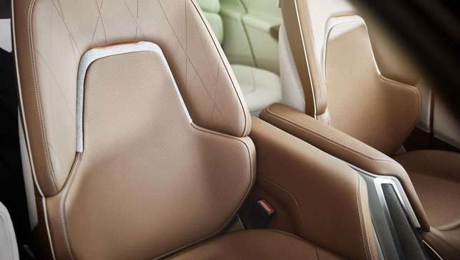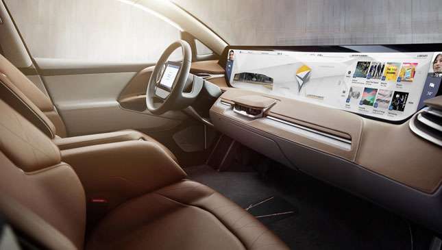 It may be a little generic to look at on the outside, but it’s very artfully crafted inside. Beyond its very intricate door handles and some neat stitching, it’s absolutely dominated by a 49in screen, which the production car will keep.