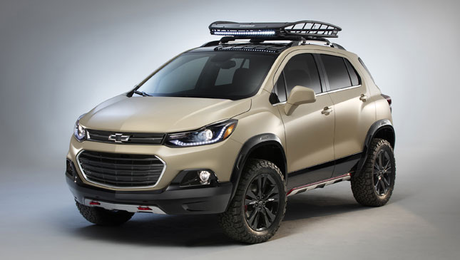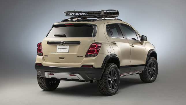 First up is the Trax Activ concept, which is based on the AWD variant of the 2017 Trax. It features a redesigned front and rear fascia. Holding up the chassis is a lifted suspension attached to eight-inch Chevrolet Accessories wheels and all-terrain tires. Custom fender flares give added protection and an off-road appearance. On top is a Thule roof basket with a custom LED light bar for added cargo and visibility. Inside is a revised interior, complete with all-weather floor liners.